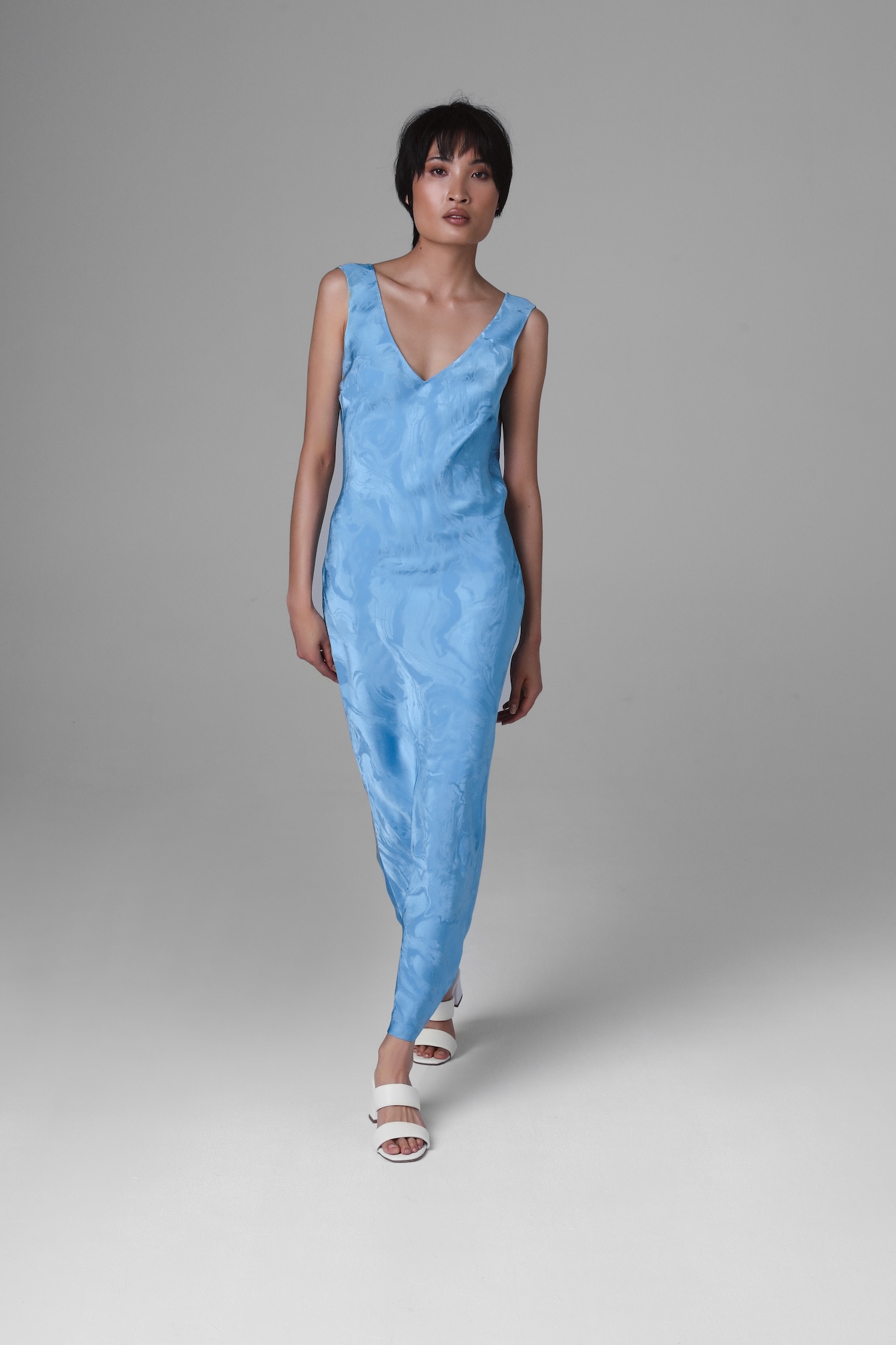 A midi dress crafted from viscose jacquard with a substantial hand, gently skimming the silhouette to offer elegance and exceptional comfort. The three-dimensional texture of the fabric lends originality to the otherwise simple cut. Bias-cut construction ensures a perfect fit, accentuating the body’s natural contours. Deep necklines at the front and back add refinement and a slenderising effect. Details such as hand-finished hems, a hallmark of our brand, highlight the highest standard of craftsmanship, imparting each creation with a unique character. This technique allows the fabric to move freely and drape naturally with the body, preserving its inherent elasticity. Such finishing results in nearly invisible stitches, minimising the risk of bulk, puckering, or distortion at the hem—especially important in bias-cut styles.