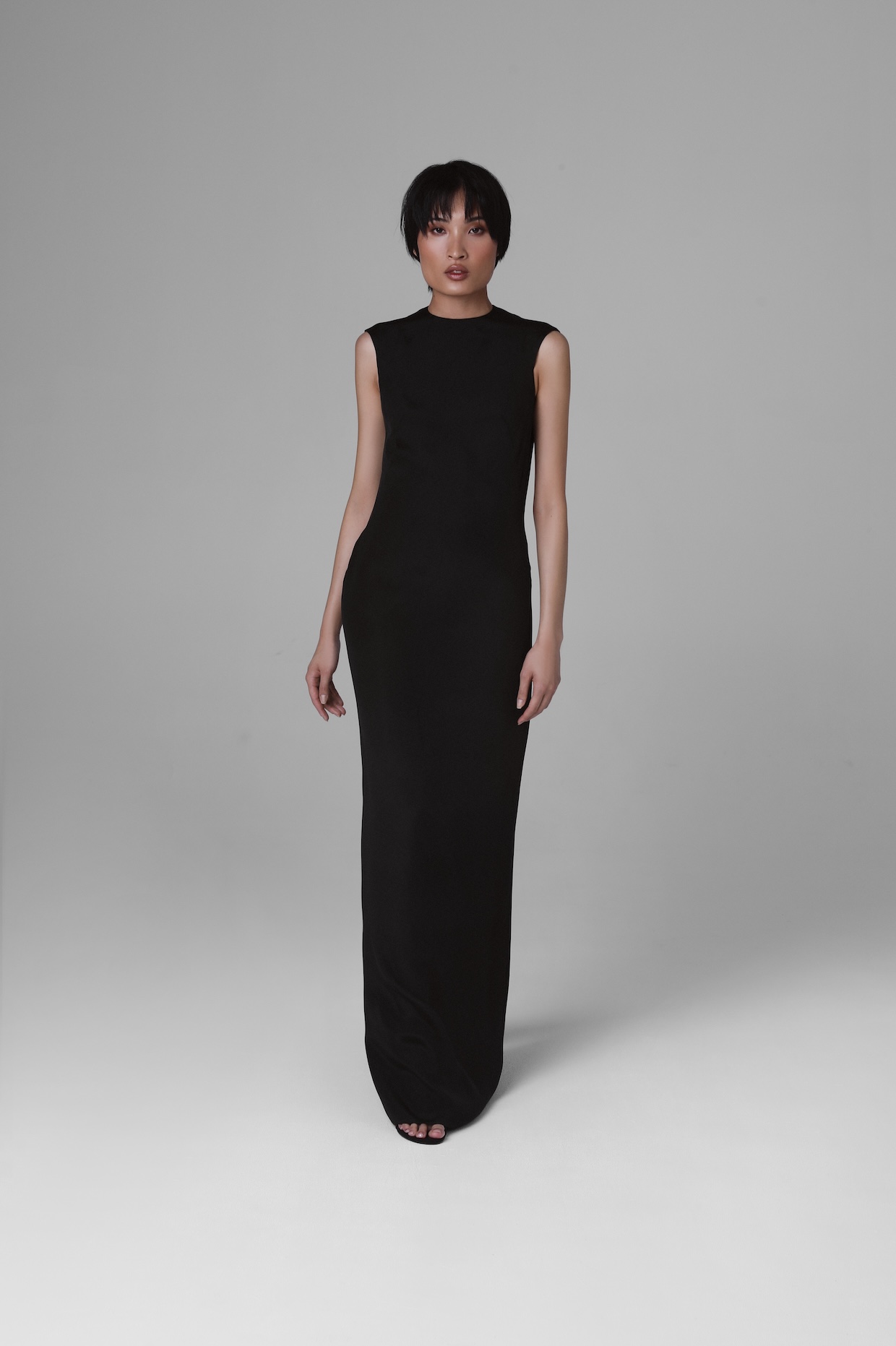 The simple, fitted midi dress is crafted from heavyweight black silk crêpe. Its streamlined silhouette, shaped by expertly placed darts, features a deep, uniquely contoured neckline and long sleeves that flare at the cuffs, lending the dress a classic, timeless character. The silk lining enhances the structural integrity of the dress, preventing fabric distortion over years of wear. It also allows for edge finishing without visible machine stitches. The choice of fabric is intentional—the crêpe weave is notably more resistant to creasing than standard weaves. Thanks to these elements, this silk dress is the perfect foundation for sophisticated ensembles suited to more formal occasions and gatherings. Every considered detail is a continuation of the finest traditions of Polish tailoring.