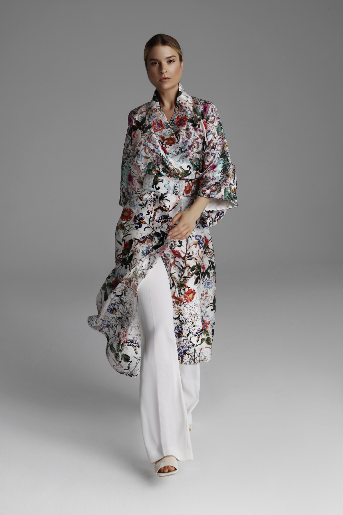 Kimono 18 is sewn with the brand's characteristic attention to detail, such as unique handmade finishes and invisible machine stitching. These emphasise the nobility of the silk fabric and allow attention to be focused on the rich, floral pattern alluding to motifs found in traditional Japanese kimonos.