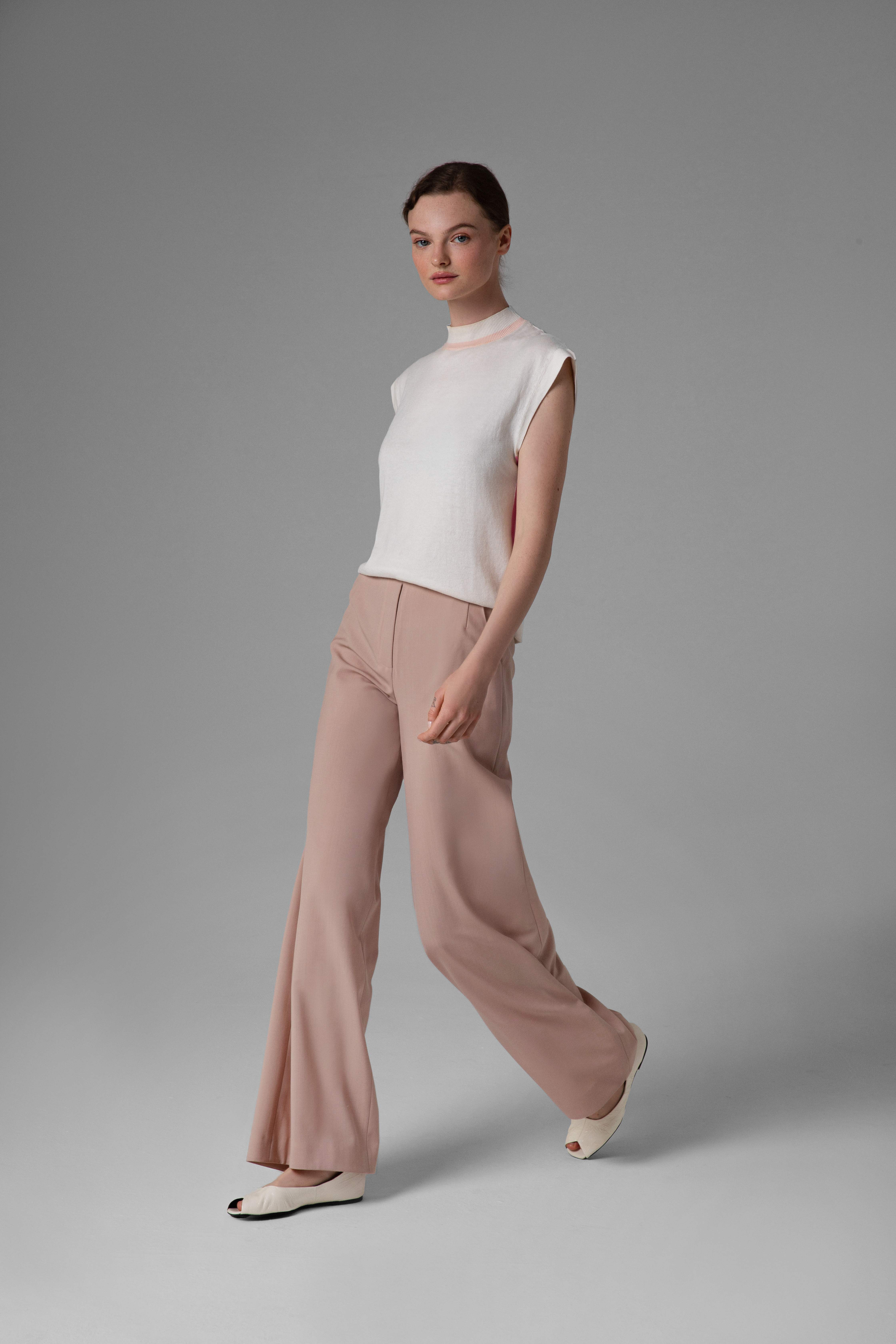 Model charakteryzuje się szerokimi nogawkami, dopasowaniem na wysokości bioder oraz wysokim stanem. Detale, takie jak ręcznie podłożone nogawek, zapewnia eleganckie, gładkie wykończenie. Wysokiej jakości wełna o prostym splocie i przemyślany krój gwarantują komfort noszenia przez cały rok.