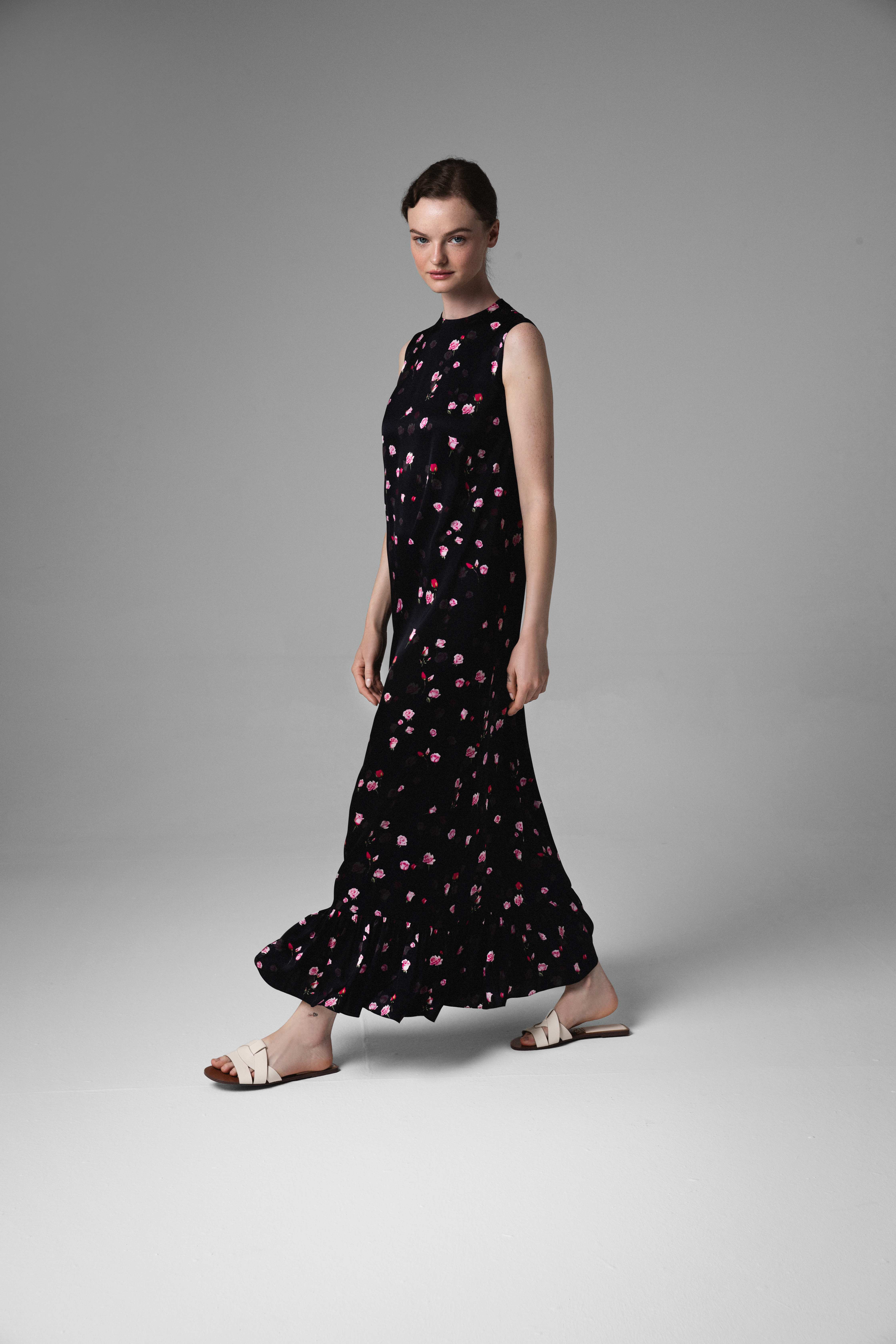 Długa, jedwabna sukienka to połączenie minimalizmu z nutą romantyzmu. Subtelny połysk tkaniny, delikatny różany wzór na czarnym tle, mocno umarszczona, krótka falbana wykańczająca dół sukienki nadają całości delikatności i lekkości podczas ruchu.