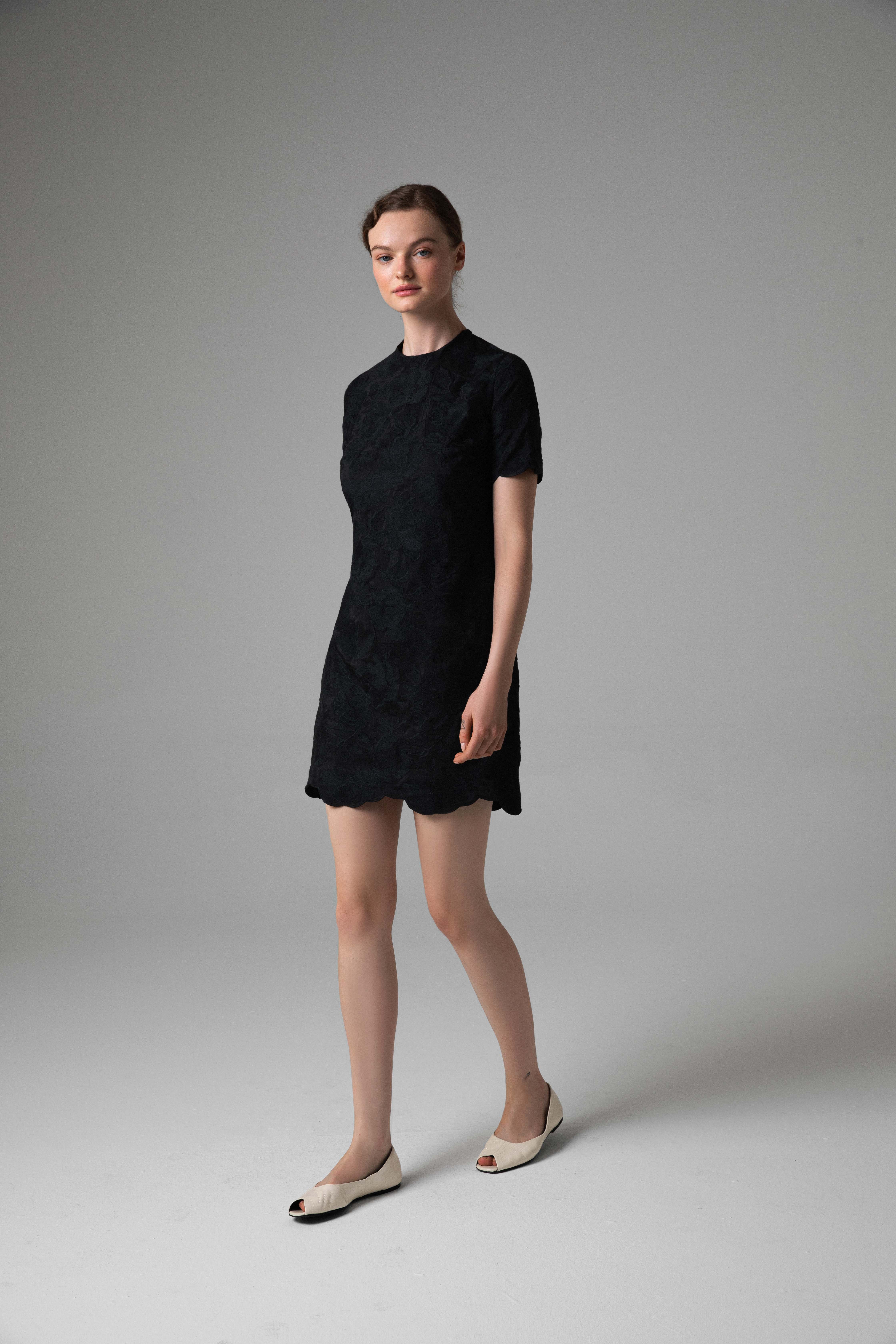 Czarna, krótka sukienka o prostym kroju z delikatnie zaznaczoną linią talii z dekoltem pod szyją i krótkimi rękawami. Ponadczasowa i uniwersalna, a jednocześnie przyciągająca uwagę dzięki artystycznemu designowi, którego nadaje przestrzenna faktura tkaniny oraz wykończenie dołu sukienki i rękawów. Minimalistyczna forma sukienki doskonale współgra z wyhaftowanymi kwiatami. Delikatna jedwabna podszewka oraz jakość wykonania zapewniają wyjątkowy komfort noszenia oraz trwałość i ponadczasowość, niezależną od sezonowych trendów.